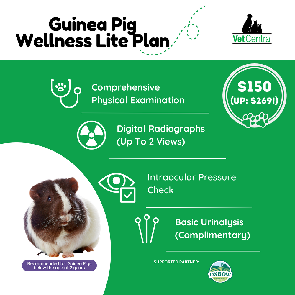 Guinea Pig Wellness Plans are vitally important to your guinea pig. Early detection is key to your pet's health and wellbeing. Choose from our three available wellness plans for the most suitable health screenings based on your guinea pig's age.